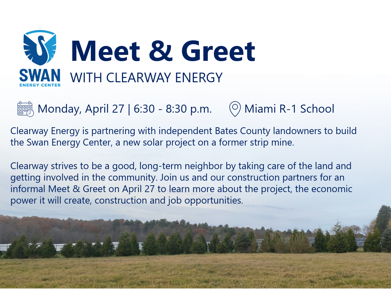 Join Clearway Energy and partners at the Miami R-1 School from 6:30-8:30 on Monday, April 27th.